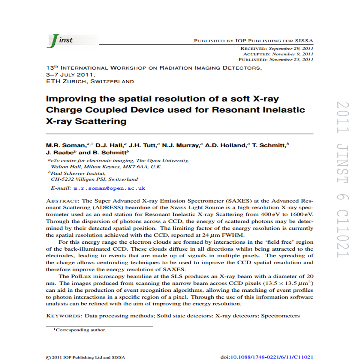 Soman, Matthew R.; Hall, David J.; Tutt, James H.; Murray, Neil J.; Holland, Andrew D.; Schmitt, T.; Raabe, J.; Schmitt, B., “Improving the spatial resolution of a soft X-ray Charge Coupled Device used for Resonant Inelastic X-ray Scattering”, Journal of Instrumentation, Vol. 6, Issue 11, p.p. C11021 (11/2011).