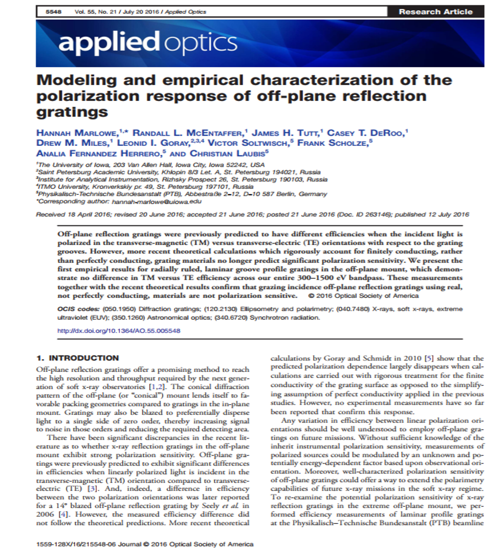 Marlowe, Hannah; McEntaffer, Randall L.; Tutt, James H.; DeRoo, Casey T.; Miles, Drew M.; Goray, Leonid I.; Soltwisch, Victor; Scholze, Frank; Herrero, Analia Fernandex; Laubis, Christian, "Modeling and empirical characterization of the polarization response of off-plane reflection gratings", Applied Optics, Volume 55, Issue 21 (2016) p.p 5548-5553