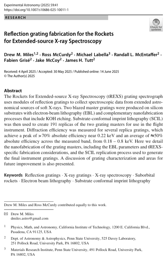 Miles, Drew M; McCurdy, Ross; Labella, Michael; McEntaffer, Randall L.; Grisé, Fabien; McCoy, Jake; Tutt, James H., “Reflection grating fabrication for the Rockets for Extended-source X-ray Spectroscopy”, Experimental Astronomy, Vol. 59, Issue 3 (2025)