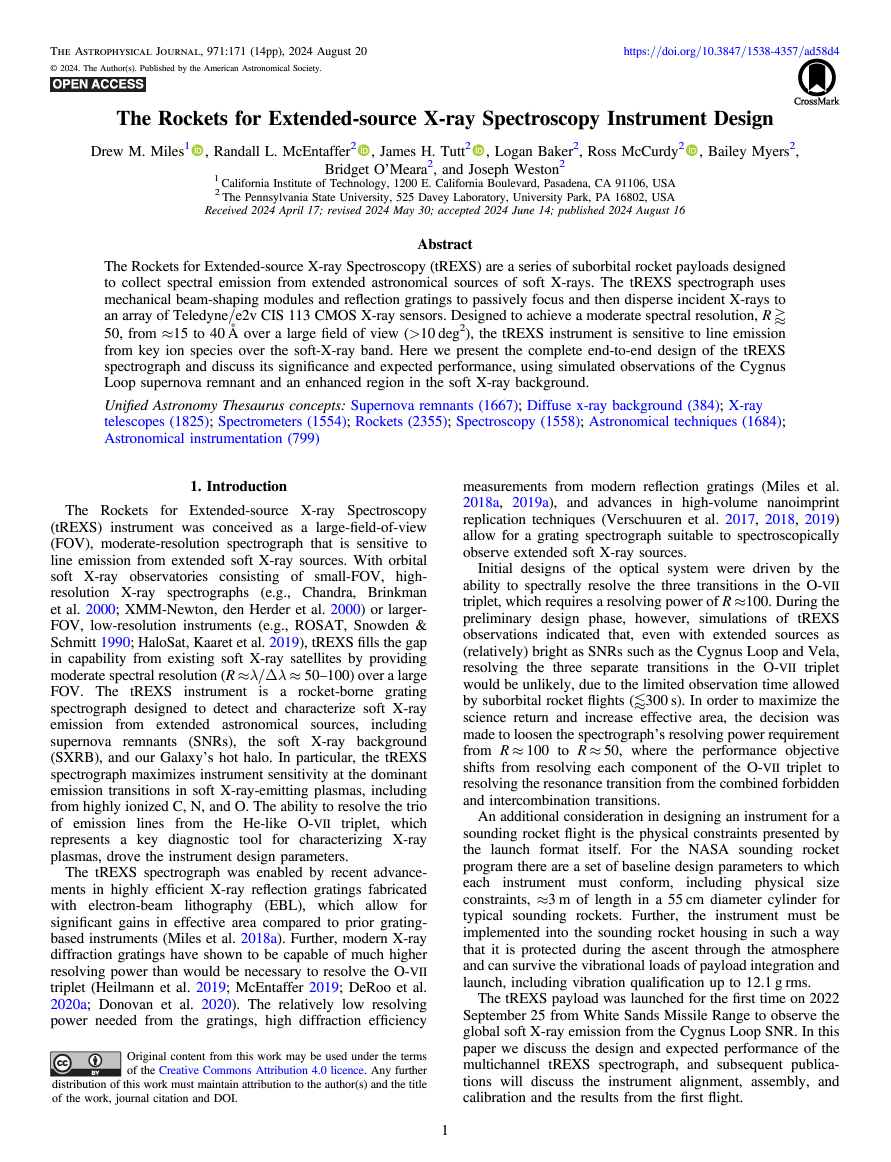 Miles, Drew M.; McEntaffer, Randall L.; Tutt, James H.; Baker, Logan; McCurdy, Ross; Myers, Bailey; O’Meara, Bridget; Weston, Joseph; “The Rockets for Extended-source X-ray Spectroscopy Instrument Design”, The Astrophysical Journal, Vol. 971, Issue 2 (2024)